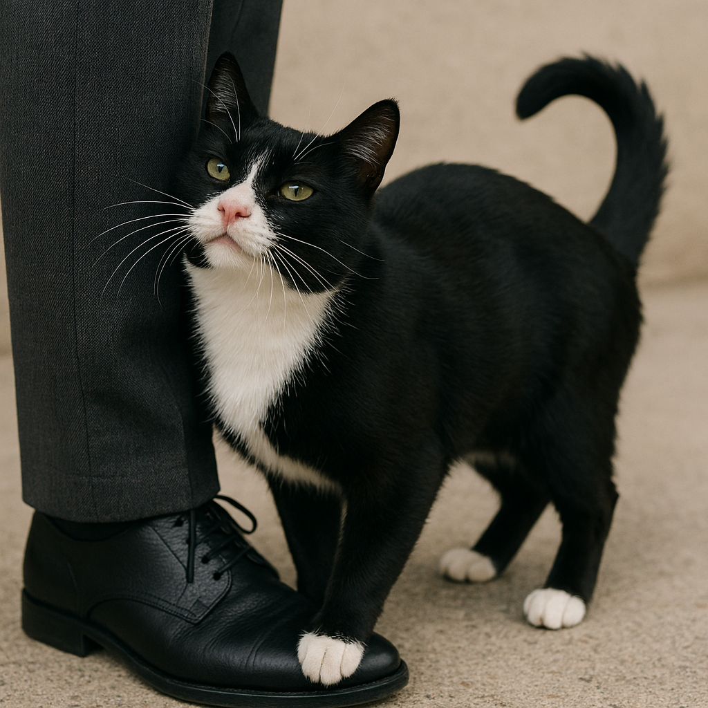 He rubs his human’s shin and knows the silk