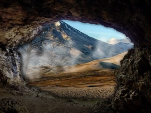 From cave depths in a mountain, mist from dark