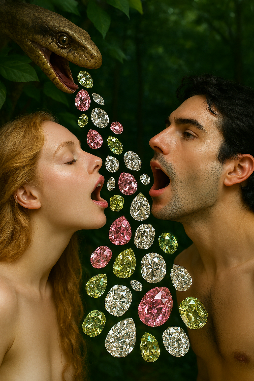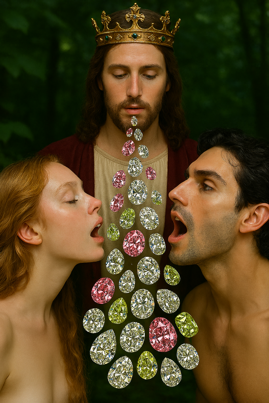 I asked Microsoft Bing’s image generator to make an image of Adam and Eve in the Garden of Eden receiving cut gemstones from the mouth of Christ. Above is the image the generator produced.