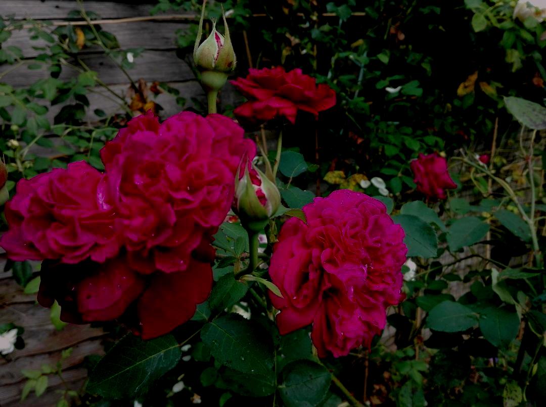 She  turns to see the roses where they blare
