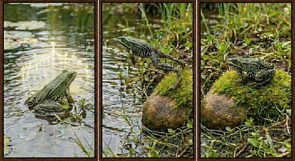 The frog and water, plop, and moss and stone