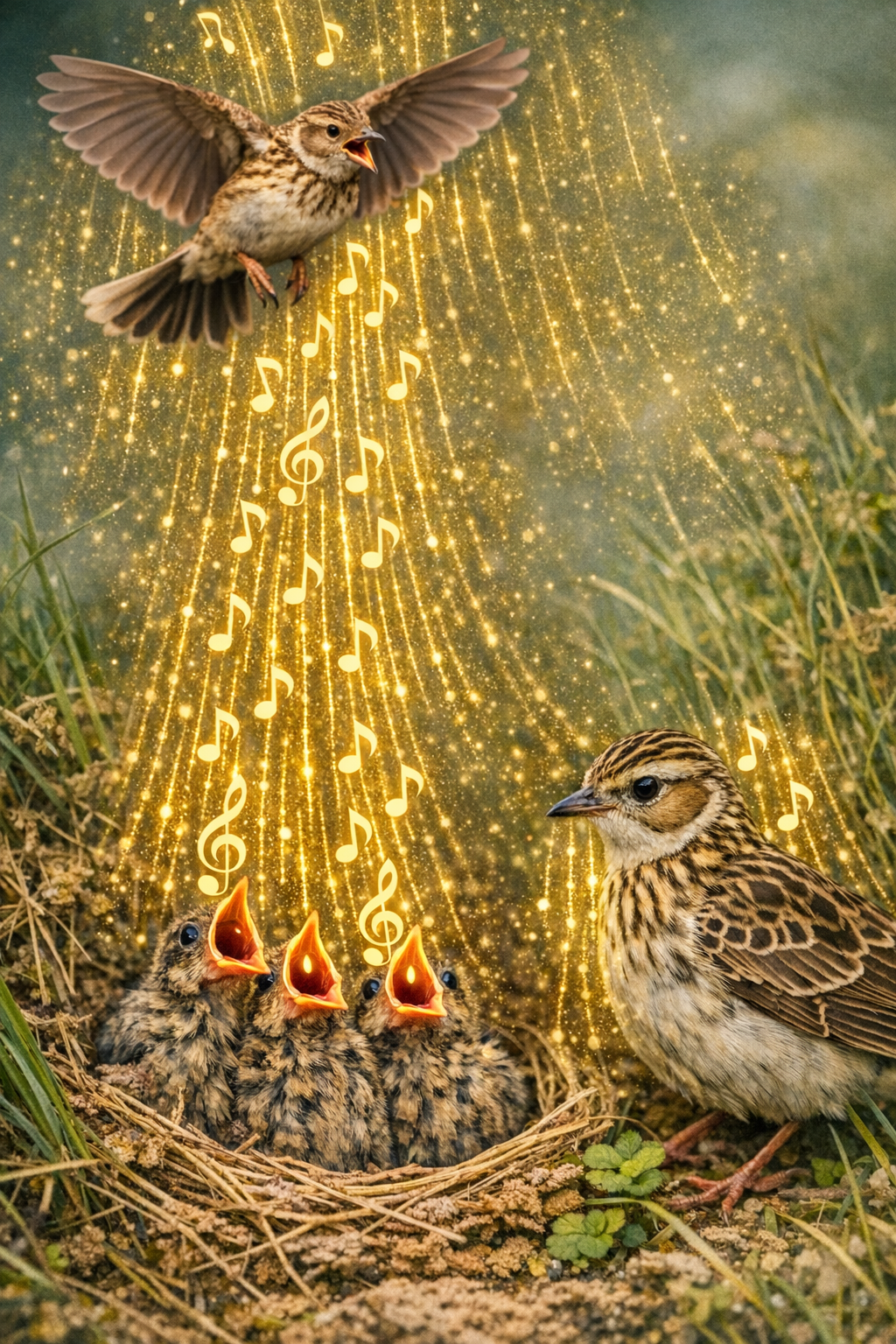 Just insects, song by little beaklings caught.